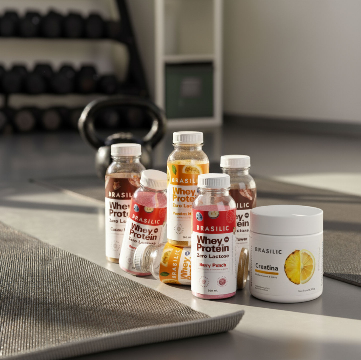 Junto dela, você recebe 6 garrafinhas de whey zero lactose — duas de cada sabor (Berry Punch, Cacau Power e Passion Mango) — todos feitos com proteína concentrada de alto valor biológico, adoçados com stevia e formulados com frutas liofilizadas ou cacau puro para garantir sabor real e ingredientes limpos. Basta completar com água, agitar e aproveitar 25g de proteína por dose.